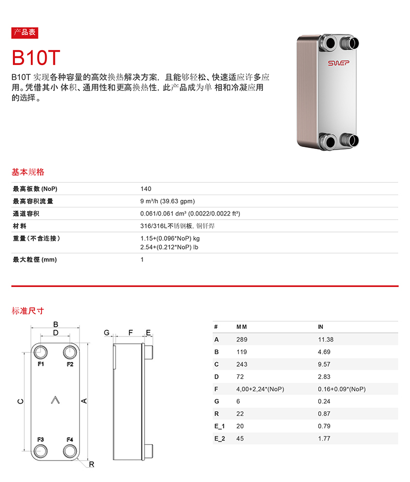 B10T 實現各種容量的高效換熱解決方案,且能夠輕松、快速適應許多應用。憑借其小體積、通用性和更高換熱性,此產品成為單相和冷凝應用的選擇。