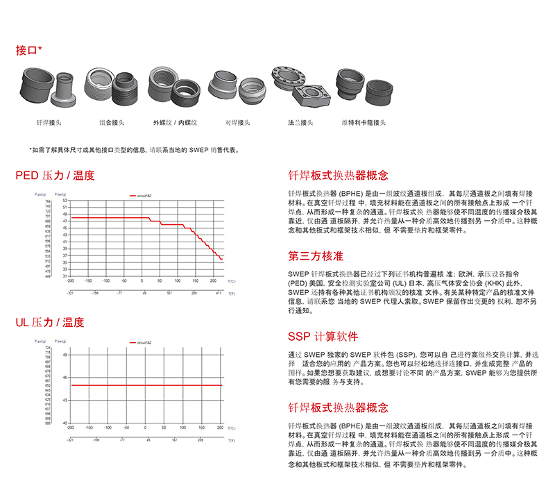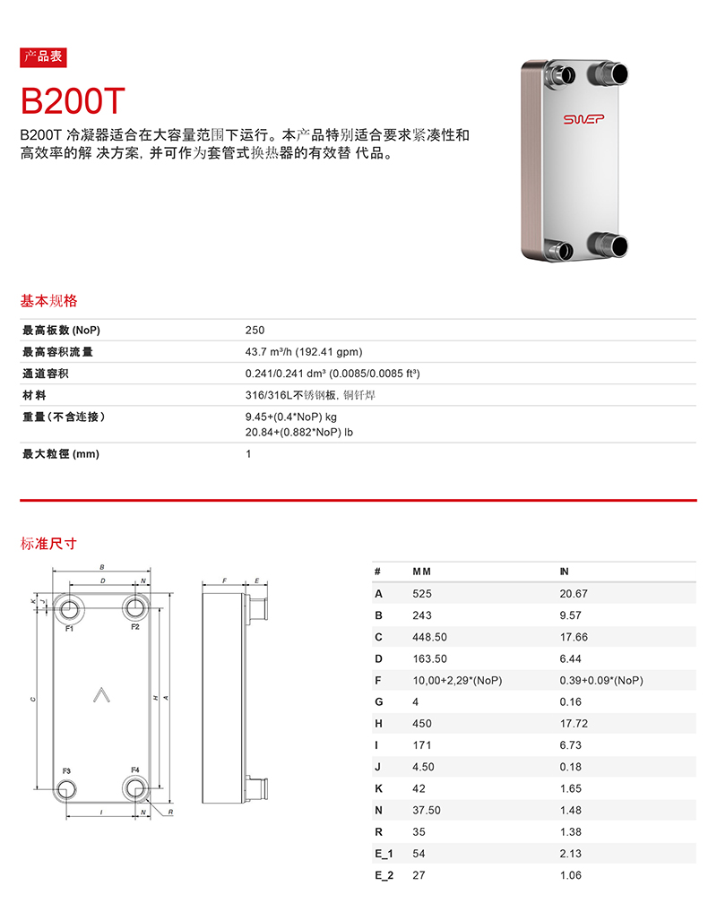 B200T 冷凝器適合在大容量范圍下運行。本產品特別適合要求緊湊性和高效率的解決方案,并可作為套管式換熱器的有效替代品。