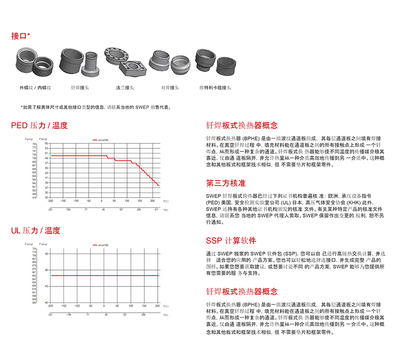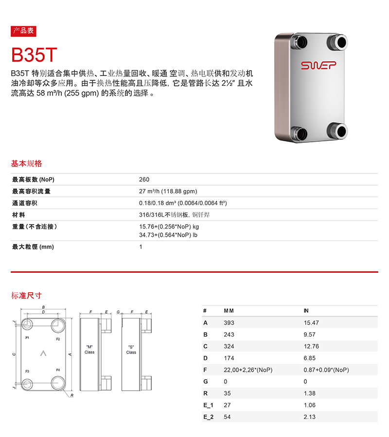 郵箱:dl_lijuan@126.comB35T 特別適合集中供熱、工業(yè)熱量回收、暖通空調(diào)、熱電聯(lián)供和發(fā)動(dòng)機(jī)油冷卻等眾多應(yīng)用。由于換熱性能高且壓降低,它是管路長(zhǎng)達(dá) 2?″ 且水流高達(dá) 58 m3/h (255 gpm) 的系統(tǒng)的選擇。
