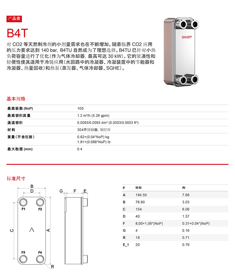 對 CO2 等天然制冷劑的小劑量需求也在不斷增加。隨著臨界 CO2 應用的壓力要求達到 140 bar,B4TU 自然成為了理想選擇。B4TU 已針對小熱負荷容量進行了優化(作為氣體冷卻器,zui高可達 30 kW)。它的緊湊性和輕便性使其適用于冷鏈應用(水回路中的冷凝器、冷凝裝置中的節能器和冷凝器、熱量回收)和熱泵(蒸發器、氣體冷卻器、SGHE)。