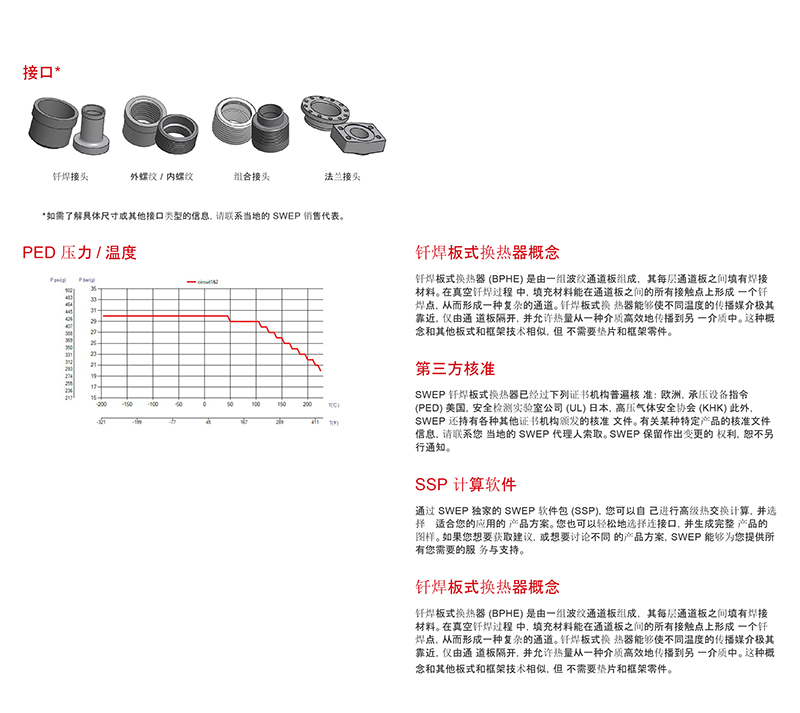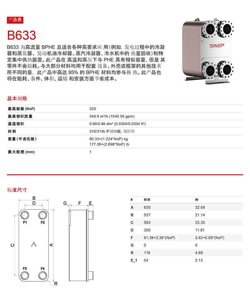 郵箱:dl_lijuan@126.comB633 為高流量 BPHE 且適合各種高要求應用(例如,發電過程中的冷凝器和蒸發器、發動機油冷卻器、蒸汽冷凝器、冷水機中的熱量回收)和特定集中供熱裝置。此產品在高溫和高壓下與 PHE 具有相似容量,但是其零件不會損耗。與大部分材料均用于配套設備、外殼或框架的其他技術所不同的是,此產品中高達 95% 的 BPHE 材料均參與換熱。此產品也將在能耗、備件、體積、運輸和安裝方面節省成本。