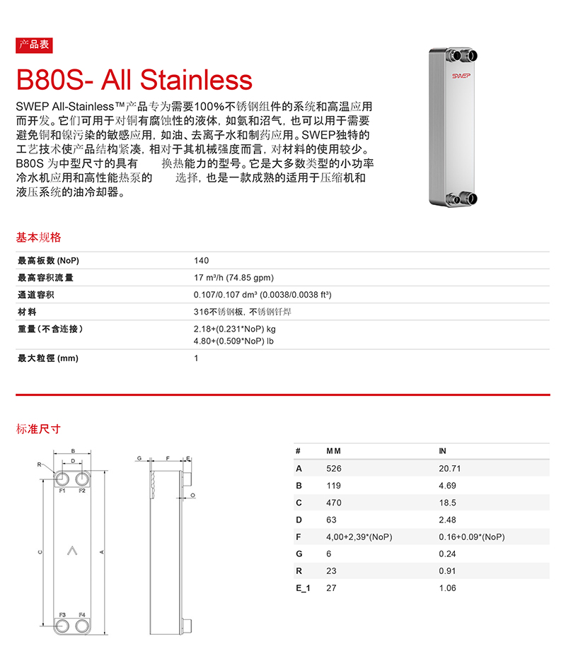 B80S 為中型高容量型號。它是大多數低容量冷水機應用和高性能熱泵的選擇。它滿足各種容量范圍的集中供熱點,并且是壓縮機和液壓裝置的成熟油冷卻器。
