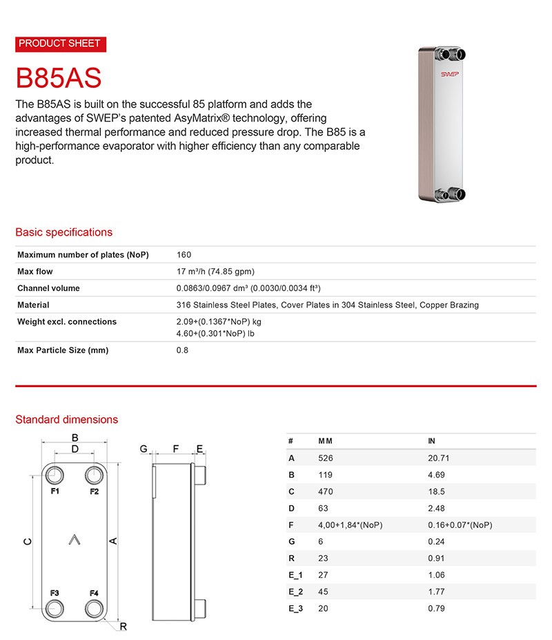 B85AS建立在運行成功的85平臺上,結合了舒瑞普的專利AsyMatrix®技術優勢,可提供更高的換熱性能,同時能夠減少壓降。B85是一款高性能蒸發器,效率高于同類產品。