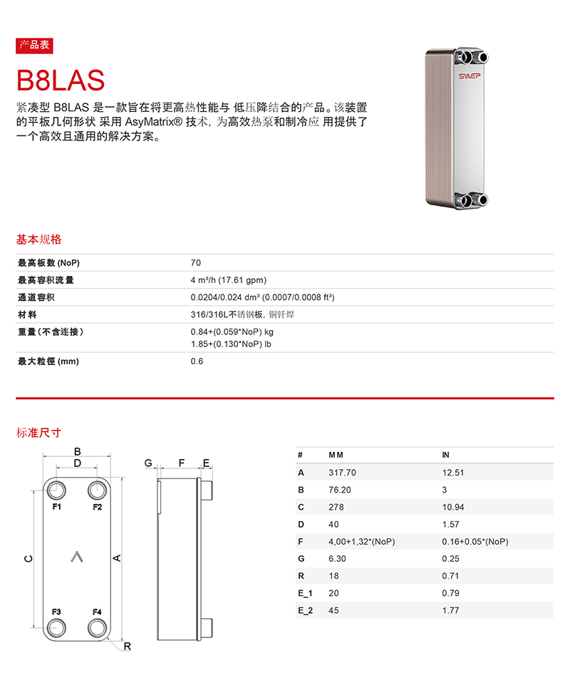 緊湊型 B8LAS是一款旨在將更高熱性能與 低壓降結合的產品。該裝置的平板幾何形狀采用AsyMatrix@技術,為高效熱泵和制冷應用提供了一個高效且通用的解決方案。