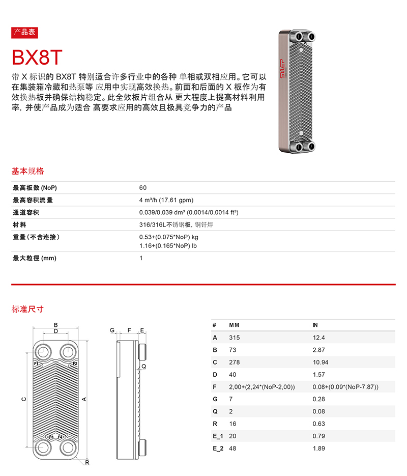 郵箱:dl_lijuan@126.com帶 X 標識的 BX8T 特別適合許多行業(yè)中的各種單相或雙相應(yīng)用。它可以在集裝箱冷藏和熱泵等應(yīng)用中實現(xiàn)高效換熱。前面和后面的 X 板作為有效換熱板并確保結(jié)構(gòu)穩(wěn)定。此全效板片組合從更大程度上提高材料利用率,并使產(chǎn)品成為適合高要求應(yīng)用的高效且具競爭力的產(chǎn)品。