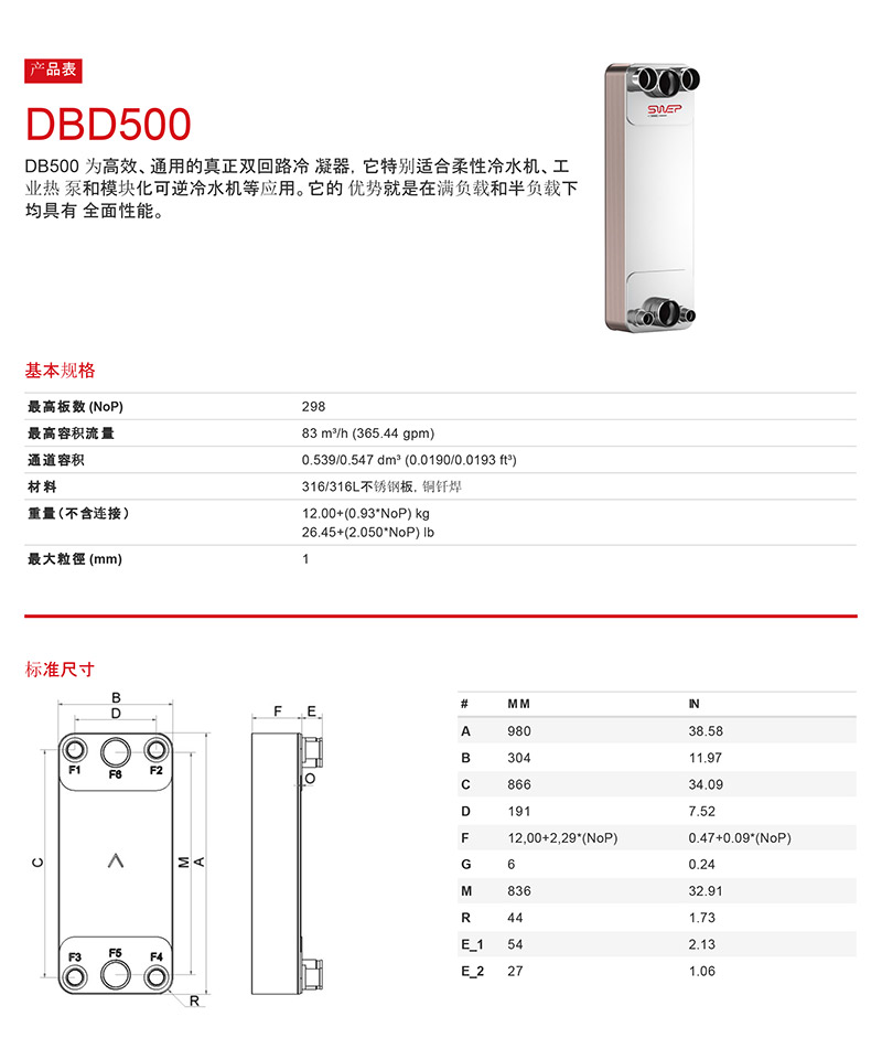 DB500 為高效、通用的真正雙回路冷凝器,它特別適合柔性冷水機、工業熱泵和模塊化可逆冷水機等應用。它的優勢就是在滿負載和半負載下均具有全面性能。