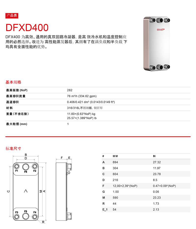 DFX400 為高效、通用的真雙回路冷凝器,是高效冷水機和溫度控制應用的必然選擇。改進為高性能蒸發器后,其擁有了在滿負載和半負載下均具有全面性能的優勢。