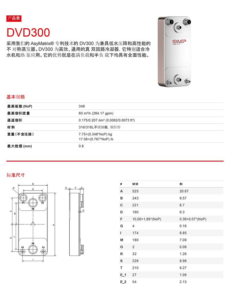 采用我們的 AsyMatrix® 專利技術的 DV300 為兼具低水壓降和高性能的不對稱蒸發器。DV300 為高效、通用的真雙回路冷凝器,它特別適合冷水機和熱泵應用。它的優勢就是在滿負載和半負載下均具有全面性能。