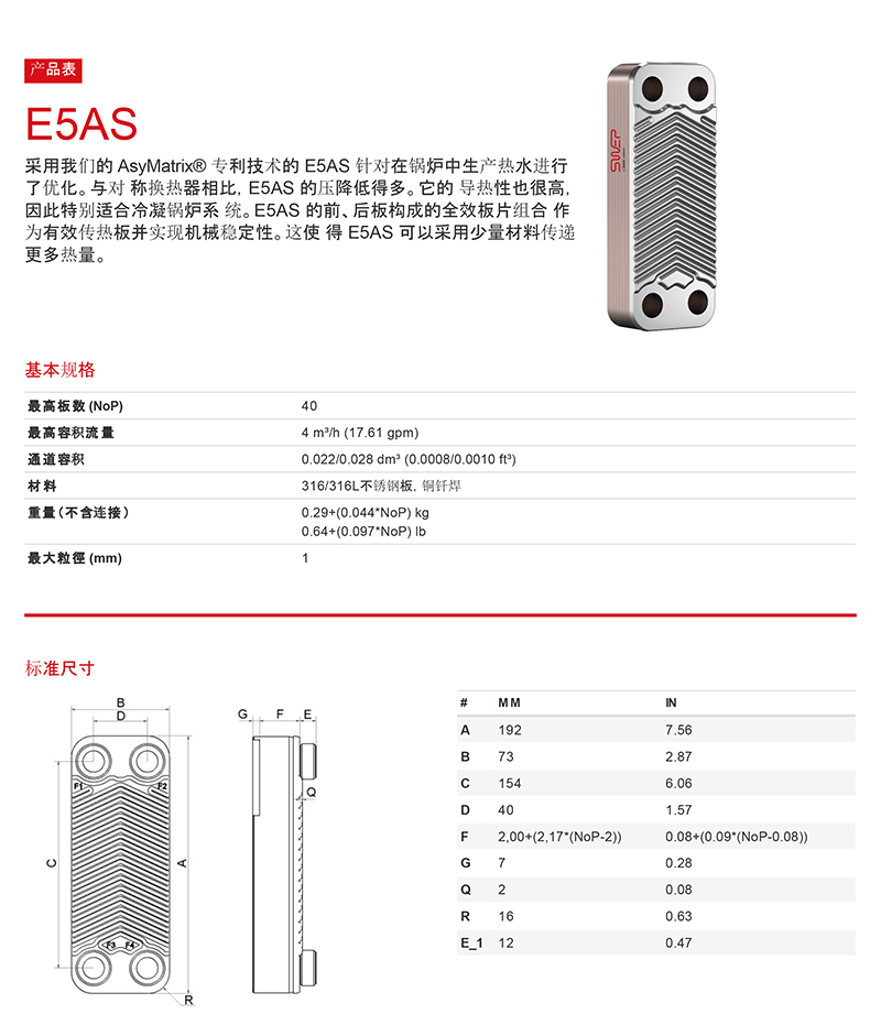 采用我們的 AsyMatrix® 專利技術的 E5AS 針對在鍋爐中生產熱水進行了優化。與對稱換熱器相比,E5AS 的壓降低得多。它的導熱性也很高,因此特別適合冷凝鍋爐系統。E5AS 的前、后板構成的全效板片組合作為有效傳熱板并實現機械穩定性。這使得 E5AS 可以采用少量材料傳遞更多熱量。