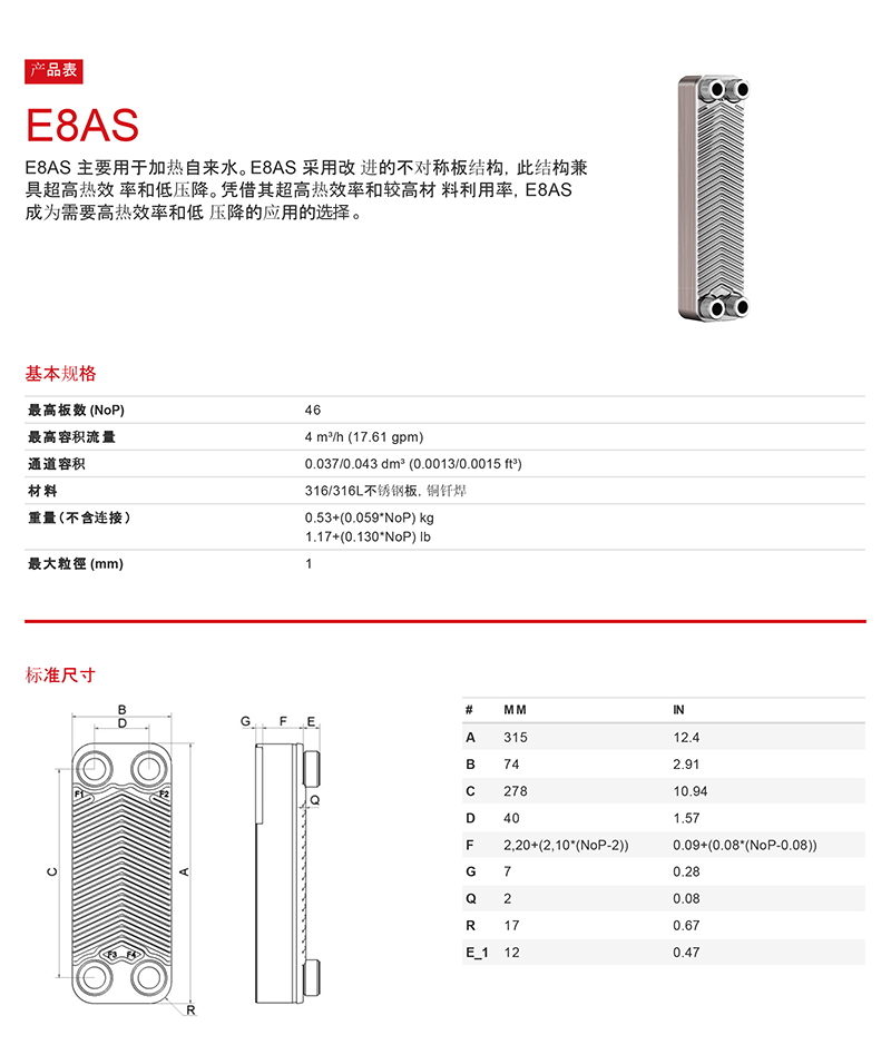 E8AS 主要用于加熱自來水。E8AS 采用改進的不對稱板結構,此結構兼具超高熱效率和低壓降。憑借其超高熱效率和較高材料利用率,E8AS 成為需要高熱效率和低壓降的應用的選擇。