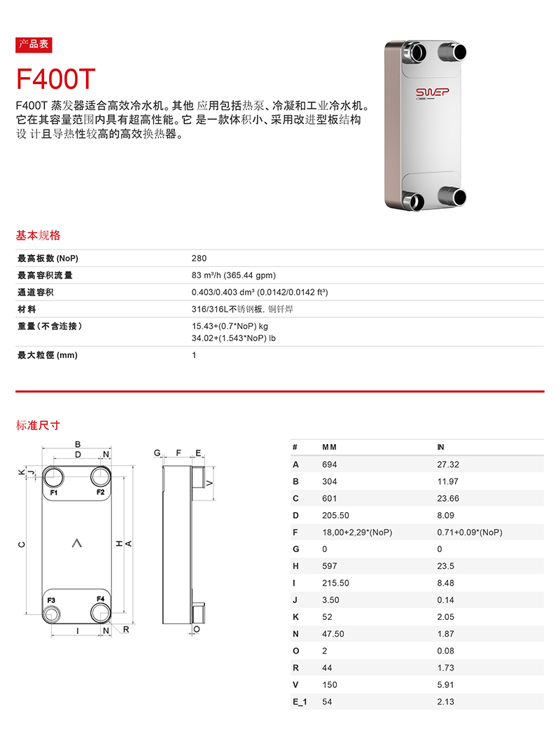 F400T 蒸發器適合高效冷水機。其他應用包括熱泵、冷凝和工業冷水機。它在其容量范圍內具有超高性能。它是一款體積小、采用改進型板結構設計且導熱性較高的高效換熱器。