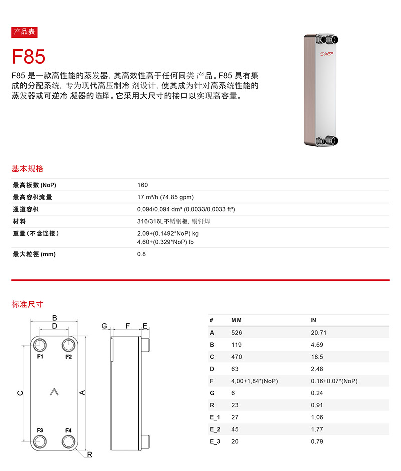 F85 是一款高性能的蒸發器,其高效性高于任何同類產品。F85 具有集成的分配系統,專為現代高壓制冷劑設計,使其成為針對高系統性能的蒸發器或可逆冷凝器的選擇。它采用大尺寸的接口以實現高容量。
