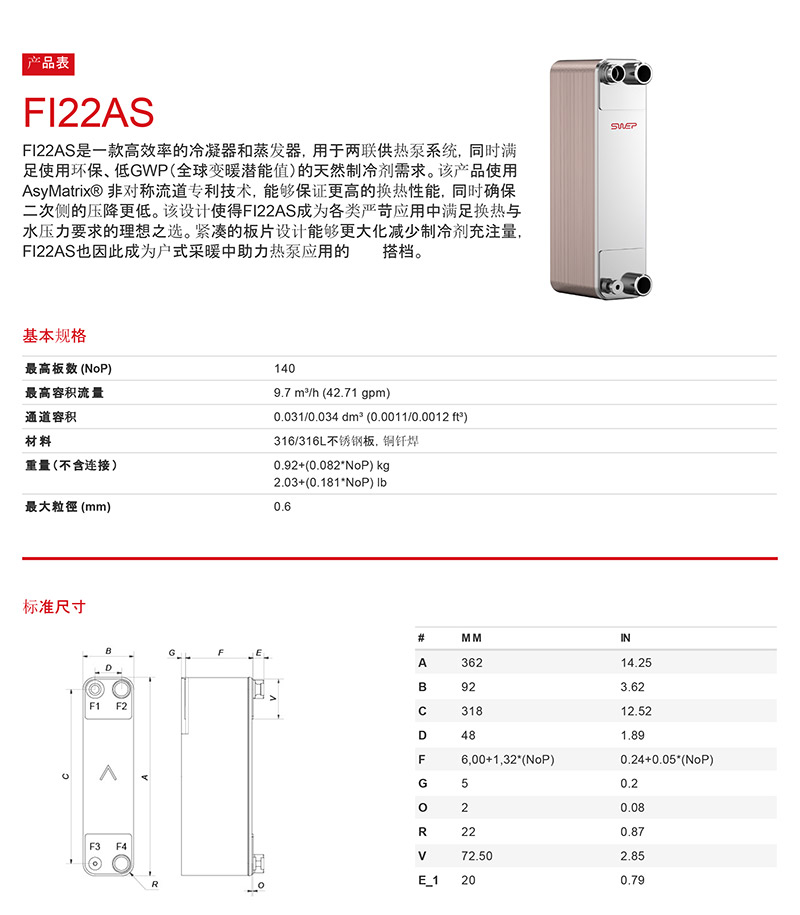 郵箱:dl_lijuan@126.comFI22AS是一款高效率的冷凝器和蒸發器,用于兩聯供熱泵系統,同時滿足使用環保、低GWP(全球變暖潛能值)的天然制冷劑需求。該產品使用AsyMatrix® 非對稱流道專利技術,能夠保證更高的換熱性能,同時確保二次側的壓降更低。該設計使得FI22AS成為各類嚴苛應用中滿足換熱與水壓力要求的選擇。緊湊的板片設計能夠更大化減少制冷劑充注量,FI22AS也因此成為戶式采暖中助力熱泵應用的搭檔。