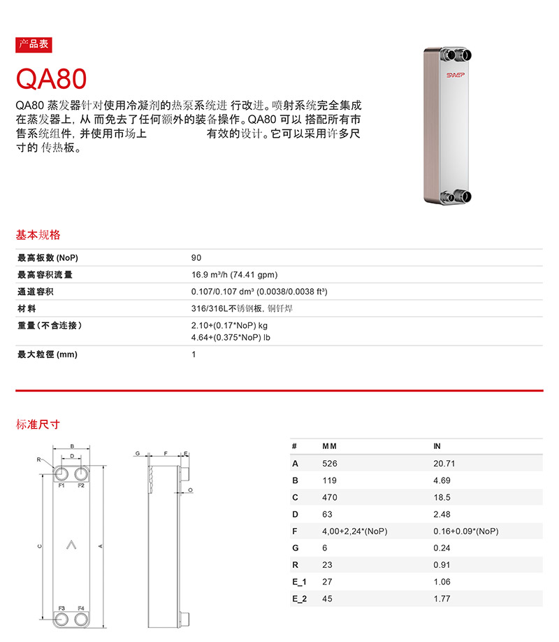 QA80 蒸發器針對使用冷凝劑的熱泵系統進行改進。噴射系統完全集成在蒸發器上,從而免去了任何額外的裝備操作。QA80 可以搭配所有市售系統組件,并使用市場上有效的設計。它可以采用許多尺寸的傳熱板。